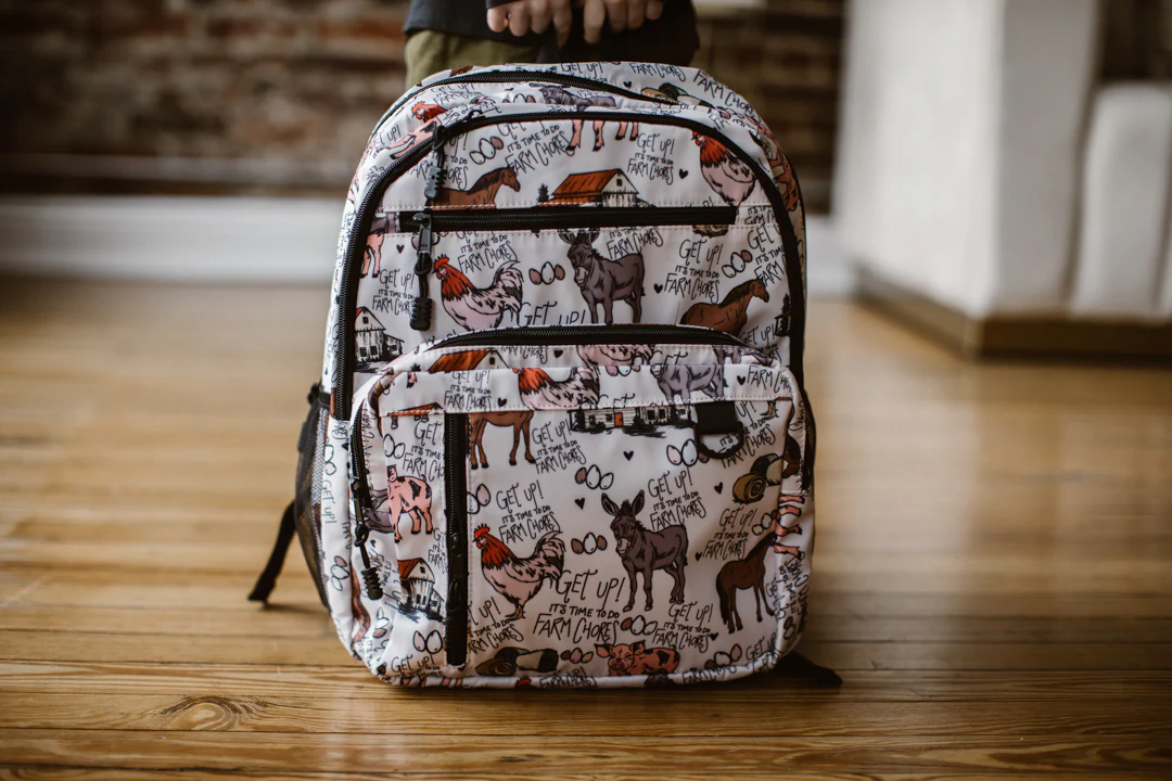 The standout feature of this backpack is the adorable illustration of our favorite farm chore friends. The are depicted with vibrant colors and playful details, showcasing what we think greatly represents the funny farm animals. The illustration adds a playful and lighthearted touch to the backpack, making it a fun and eye-catching accessory.