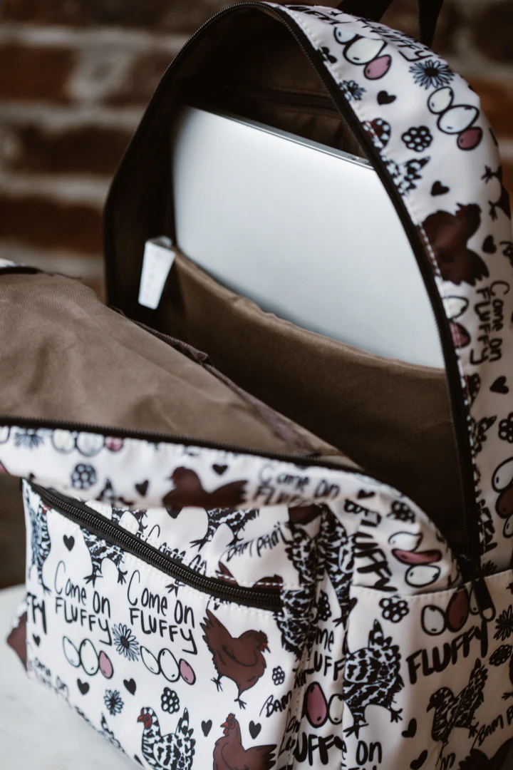 Introducing the Forever Fluffy Backpack! This long awaited backpack features an illustration of Matt's beloved chicken girl, Fluffy. This bag in honor of her memory is a charming and whimsical accessory to any travel, school functions, or every day use. It is designed to be both functional and visually appealing. The backpack itself is made of durable materials, ensuring longevity and reliability. It offers ample storage space with multiple compartments and pockets, allowing for organized storage of belongings.