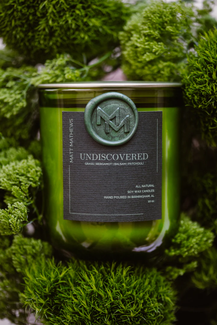 Undiscovered opens with the crisp, invigorating scent of fresh-cut grass and bright, zesty bergamot, evoking the feeling of a sun-drenched meadow. As it burns, it reveals a grounding heart of warm balsam and earthy patchouli, creating a rich, sophisticated aroma that is both comforting and captivating.